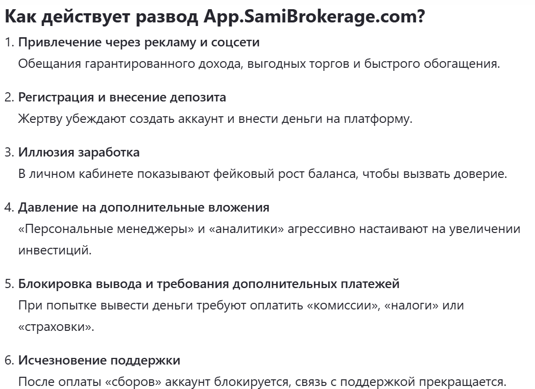 Организация SamiBrokerage вызывает сомнения в своей прозрачности. Существует ряд причин, по которым ее деятельность можно считать мошеннической: