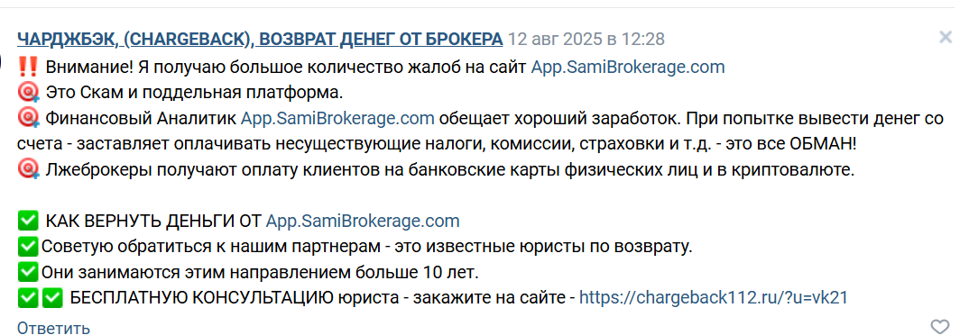 Мы не рекомендуем сотрудничать с SamiBrokerage. Если у вас есть опыт взаимодействия с этой платформой, поделитесь им в комментариях.