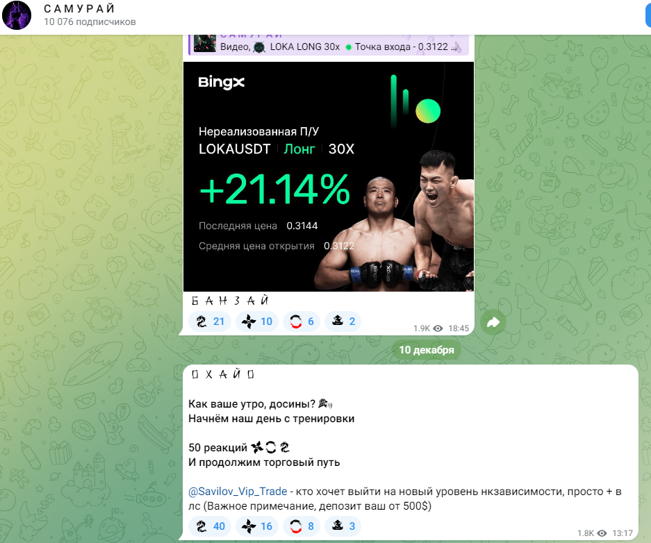 Иногда можно встретить публикации с приглашением в закрытый чат. Якобы в нем, автор обещает выкладывать настоящие качественные сигналы. Он не раскрывает преимуществ и недостатков своей закрытой группы. Автор канала советует положить около 500 долларов на его кошелек, чтобы получить крупную прибыль после вступления в сообщество.Отзывы о деятельности «Самурай»