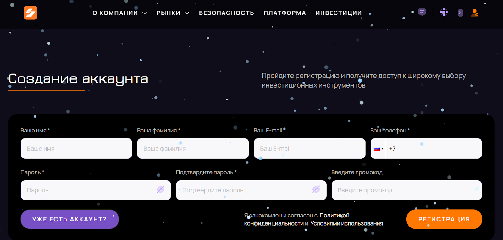 Все условия: комиссии, спреды и депозиты – становятся известны, только после того как клиент заполнит форму регистрации. Надо вносить персональные данные: имя, фамилию и номер телефона. С незнакомыми организациями – это большой риск.