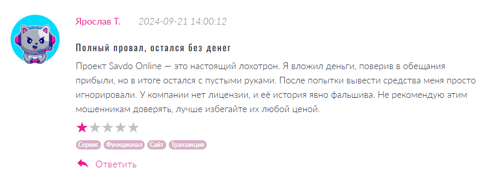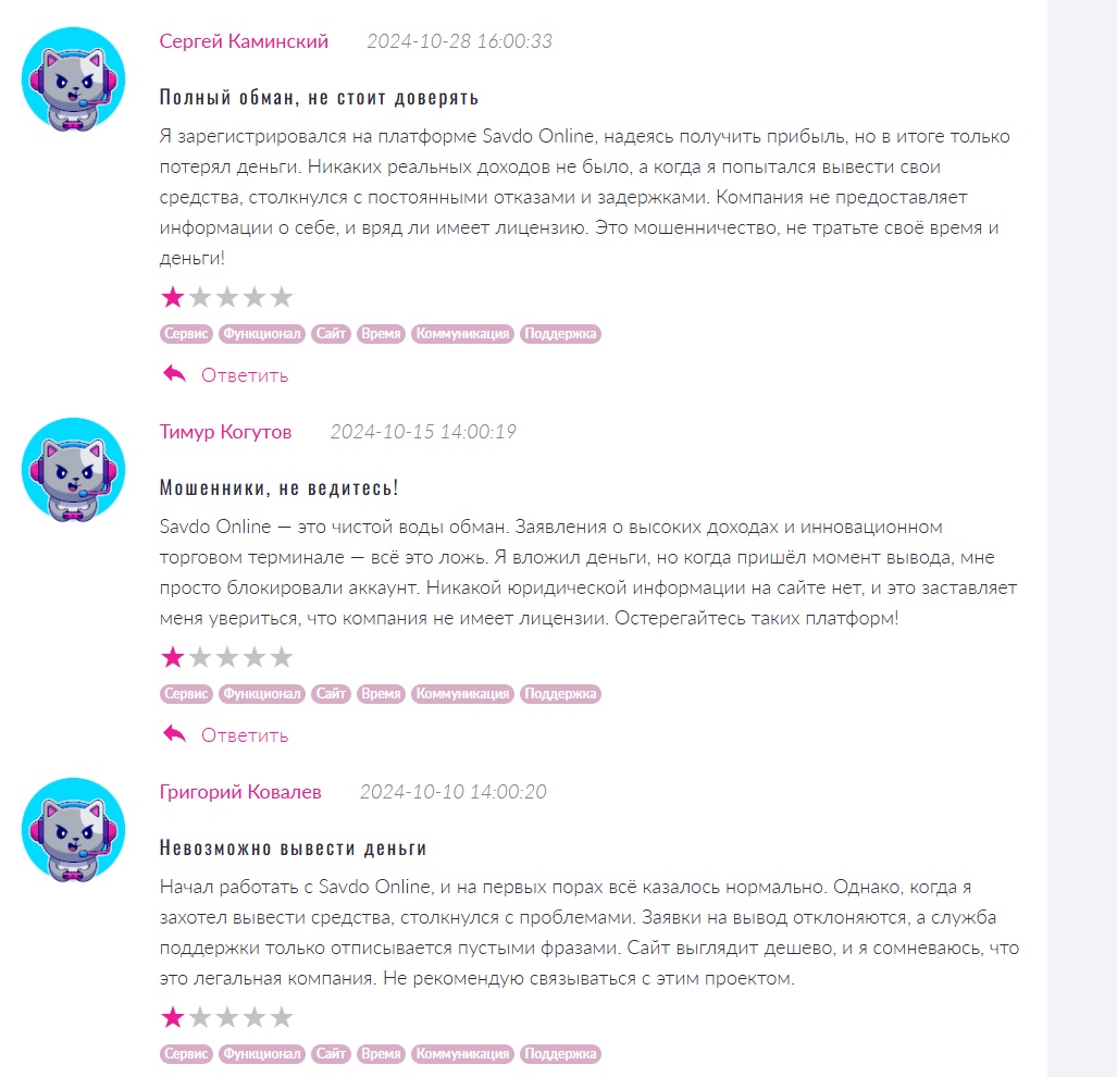 Официальным сайт «Савдо Онлайн» находится под блокировкой. Причины ограничения платформы остаются неизвестными. Нашей редакцией пришлось брать всю информацию с независимых интернет-источников. Ни одного положительного упоминания об этой фирме найти не удалось.