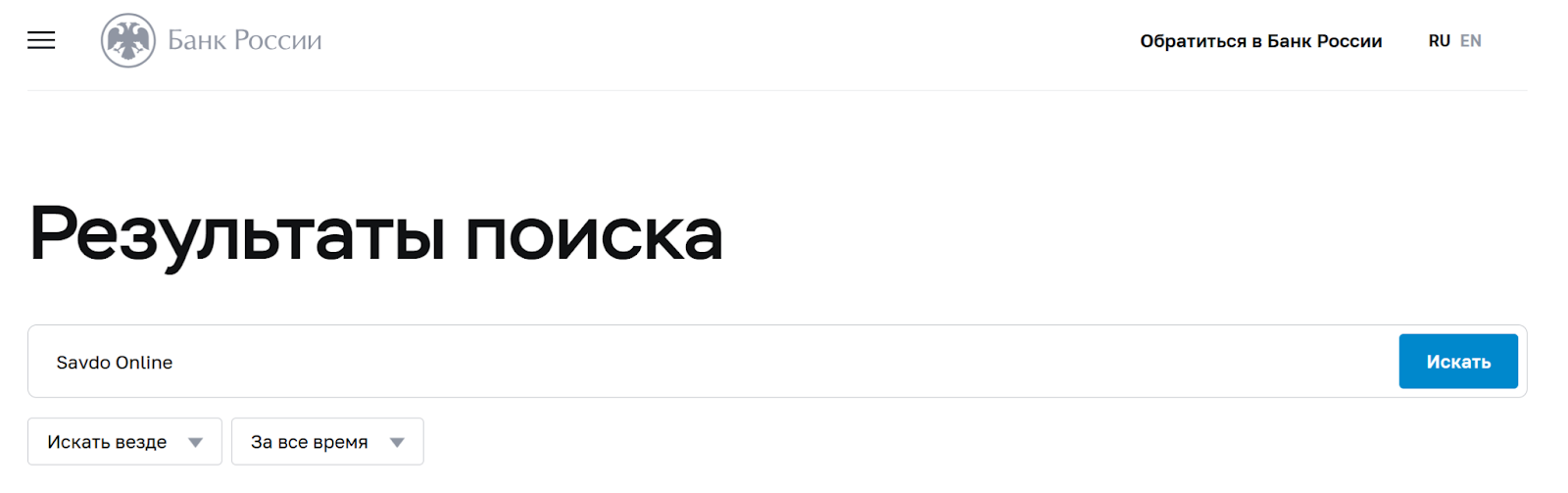 Упоминаний о юридическом статусе на сайте не было. Отсутствует любая информация о лицензиях или регулирования со стороны финансовых организаций. В случае если у клиента возникнут конфликтные ситуации с брокером, то государственные органы не смогут ему ничем помочь. В реестре Центрального Банка РФ не оказалось платформы Savdo Online. Это говорит о том, что деятельность брокера на территории России являлась незаконной.