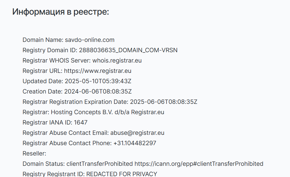 Сайт savdoonline com был зарегистрирован в июне 2024 года. Срок действия домена является коротким, поскольку он продлен до 6 июня 2025 года. Надежные брокеры имеют домены, которые зарегистрированы на длительный срок и публикуют информацию о лицензиях. Сайт был ориентирован на быстрое привлечение неопытных пользователей. Контент был переполнен общими фразами, но не содержит конкретных данных, которые могли бы подтвердить их профессионализм.