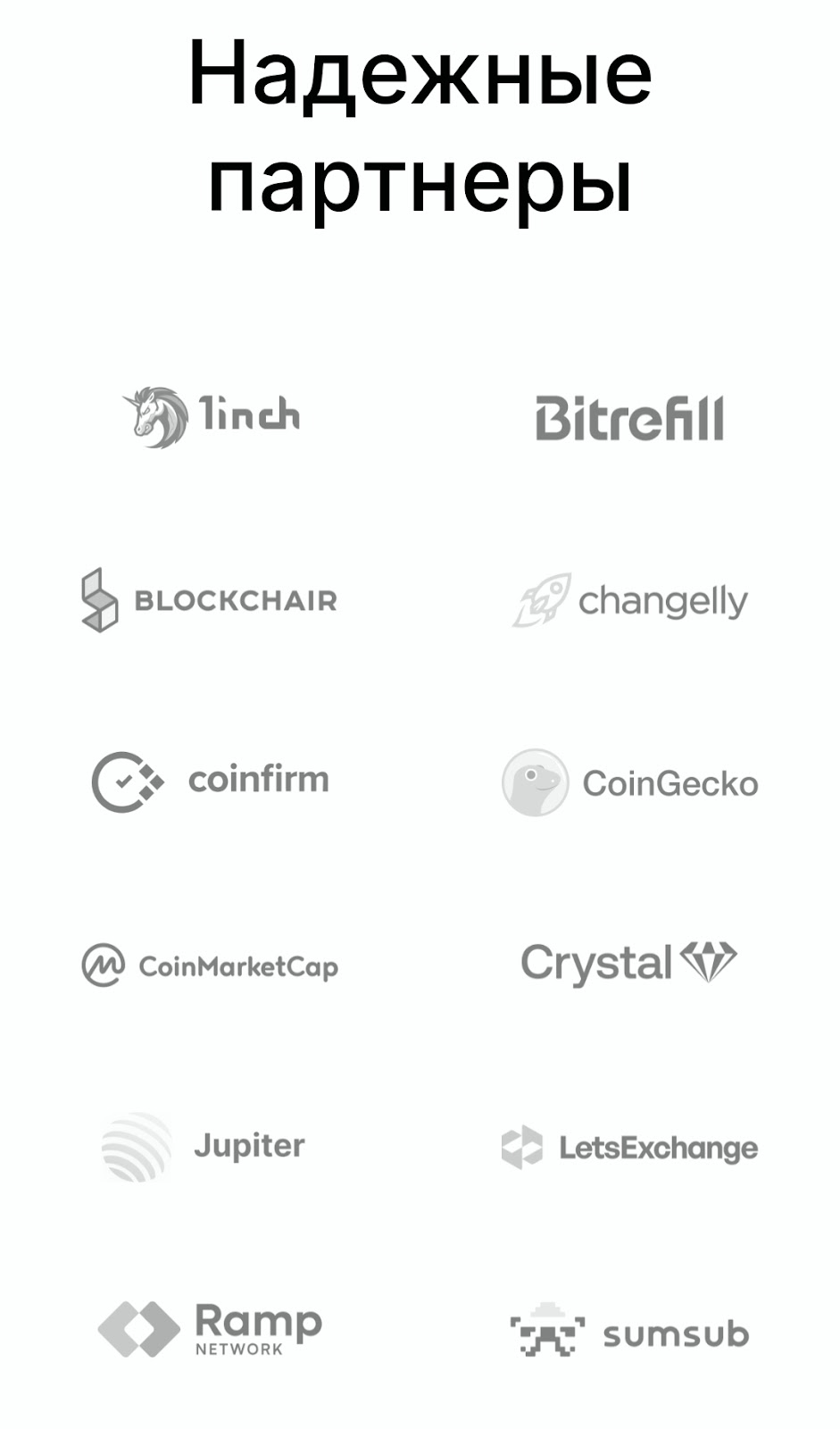 На официальном сайте проекта есть информация о всех принимаемых валютных парах, среди них BTC, DOGE, ETH и другие популярные криптовалюты.Внизу страницы приведен список компаний-партнеров, например, BlockChair или Changelly, все они сотрудничают как раз таки с исходным кошельком, который заменили при обновлении сайта.