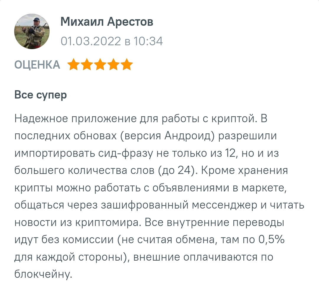 Еще один из клиентов, Михаил, также доволен кошельком, ему нравится приложение и возможность увеличить сид фразу с 12 слов до 24.