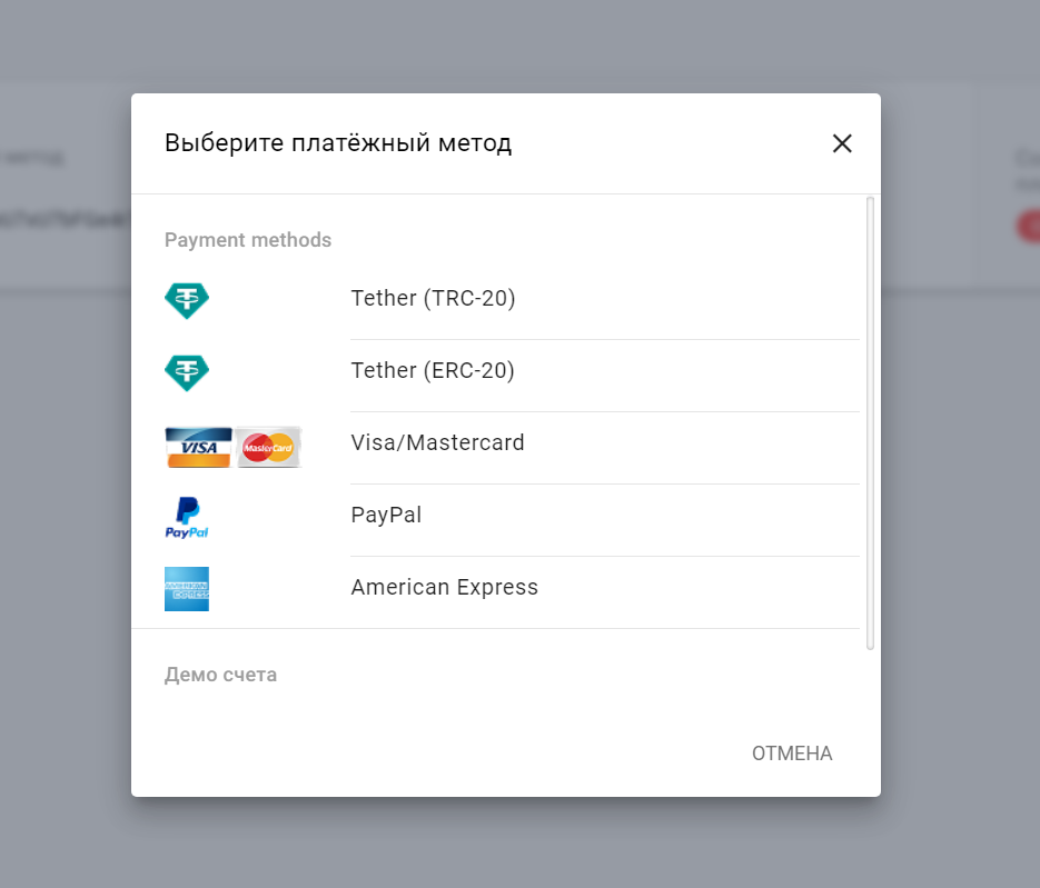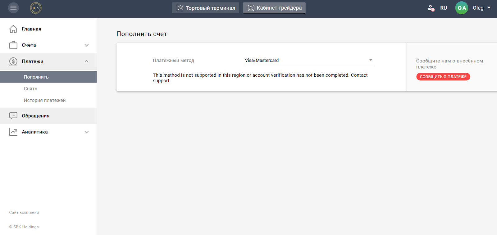 При первом входе предлагаются доступные способы для внесения денег на счет. Доступные варианты одинаковые и для того, чтобы пополнить счет, и чтобы выводить прибыль. Для клиентов из РФ оптимальным вариантом является криптовалюта, однако в таком случае неизвестен конечный получатель.Данных о комиссиях взимаемых SBK Holdings Global с каждой сделки нет, как и аналогичной информации про сбор, чтобы вывести депозит с кошелька.