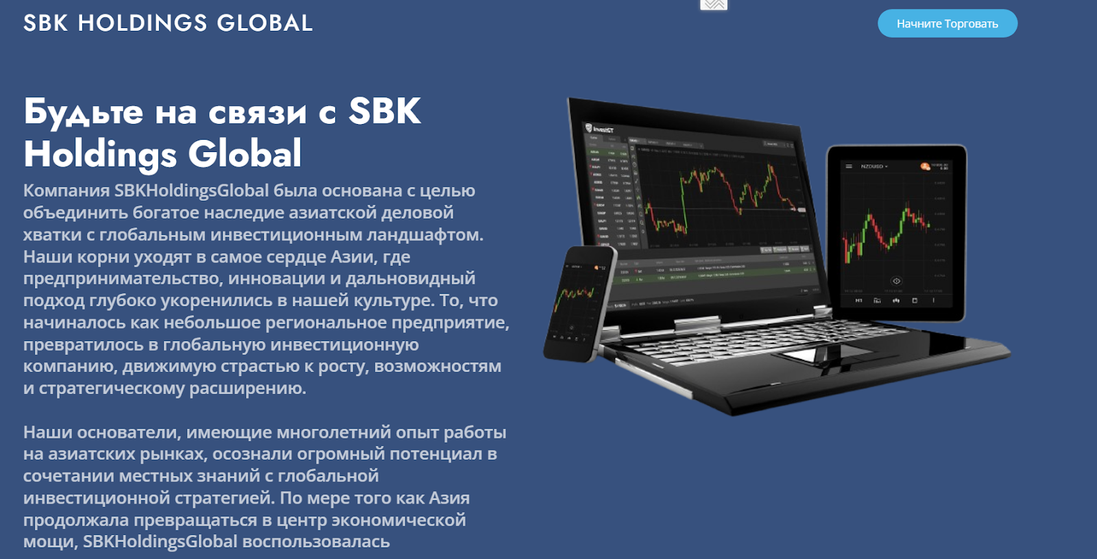SBK Holdings Global — это мульти рыночный брокер, выделяющийся среди конкурентов происхождением. Проект начал свою работы в Азии, что по словам создателей сказалось сильное влияние на высокую культуру сервиса и ответственность, свойственную всем азиатским народам. Торговля с брокером гарантирует безопасность денег клиентов на счету и доступ к возможности заработать на рынках Азии. Мы изучили наличие отзывов реальных клиентов насколько надежные платежный и торговый терминал предлагает организация SBK HoldingsGlobal, а также проанализировали деятельность на бирже, установленные комиссии и прозрачность условий ведения счета.