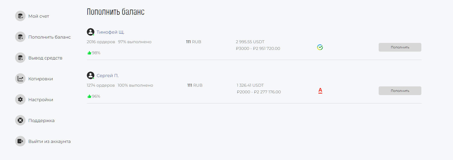 Пополнить счет можно только на банковские карты частных лиц в Сбербанке или Т-Банке. Клиент покупает USDT якобы на P2P маркетплейсе. При этом курс обмена явно завышен, а минимальная сумма для покупки составляет 3000 рублей. При регистрации пользователь обязан предоставить свой номер мобильного телефона, а заявка на приобретение или продажу крипты потребует ввести банковскую информацию о карте. Это огромный минус, так как личные данные клиента попадают в третьи руки и могут быть использованы для причинения материального ущерба. Вывести капитал можно на карты любых банков, во всяком случае так указано на сайте. Нужно оформить заявку и предоставить реквизиты. Операцию обещают выполнить мгновенно, сведений о комиссиях нет.