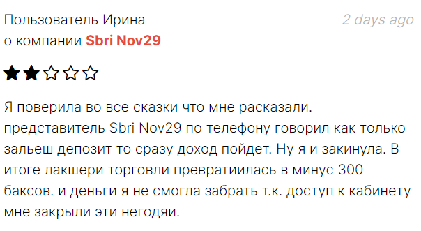 О работе Sbri Nov29 отзывы в интернете в основном негативные. Бывшие клиенты площадки не советуют заниматься трейдингом на данном сайте. Они пишут, что потеряли деньги, а прибыль, которую им обещали, так и не увидели.