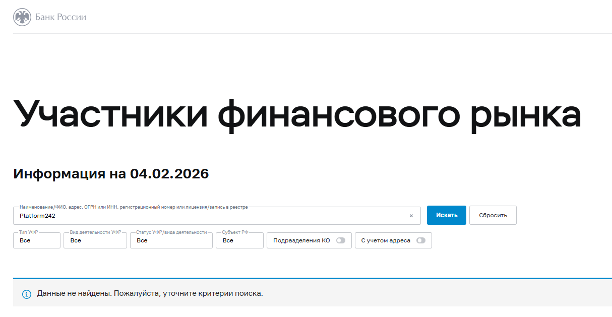 Из-за отсутствия доступа к сайту также не получится узнать о лицензиях проекта и сотрудничестве с регуляторами, поэтому рассматривать вопрос инвестиций сложно. Мы предполагаем, что проект «Платформ 242» нигде не зарегистрирован, поскольку при ручной проверке информации в разных базах надзорных органов не обнаружено совпадений.