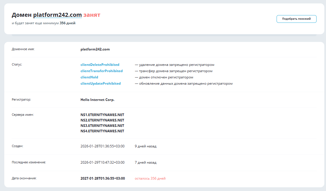 Сам адрес Platform 242 com зарегистрировали в конце января 2026-го, на момент подготовки обзора он используется на протяжении 9 дней. То есть, компанию никак не назвать «бывалой» на рынке, поскольку это новый ресурс без опыта и репутации.