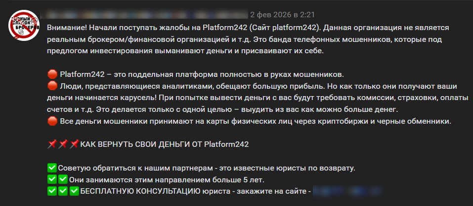 В сети нет упоминаний об электронной почте Platform 242, физическом офисе или других контактах поддержки, поэтому нет смысла пытаться самостоятельно обратиться к администрации проекта. Все это указывает на высокий риск потерять деньги и низкое качество обслуживания, поскольку проверенные брокеры обычно пытаются облегчить коммуникацию с клиентами.
