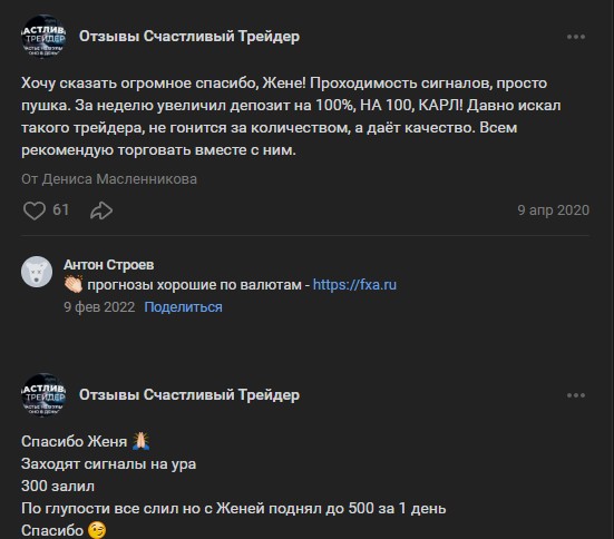 Автор комьюнити заманивает новичков нарисованной статистикой и фейковыми отзывами. Затем заставляет их регистрироваться у нужного ему брокера и дает убыточные сигналы, чтобы они как можно быстрее слили свой депозит. Никакого реального обучения или прибыльной торговли здесь нет и быть не может. «Счастливый трейдер» – это просто конвейер по заработку на просадках доверчивых людей.