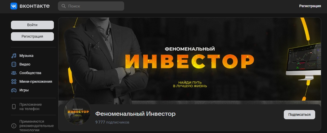 Итак, что нам предлагает «успешный инвестор» Евгений Ковальчук? Вся его империя построена вокруг нескольких тематических пабликов в ВК – основное сообщество «Феноменальный Инвестор» и группа @schaste trader. Главный продукт – доступ в платное комьюнити, где автор выдает сигналы и показывает свою «исключительно прибыльную» торговлю.