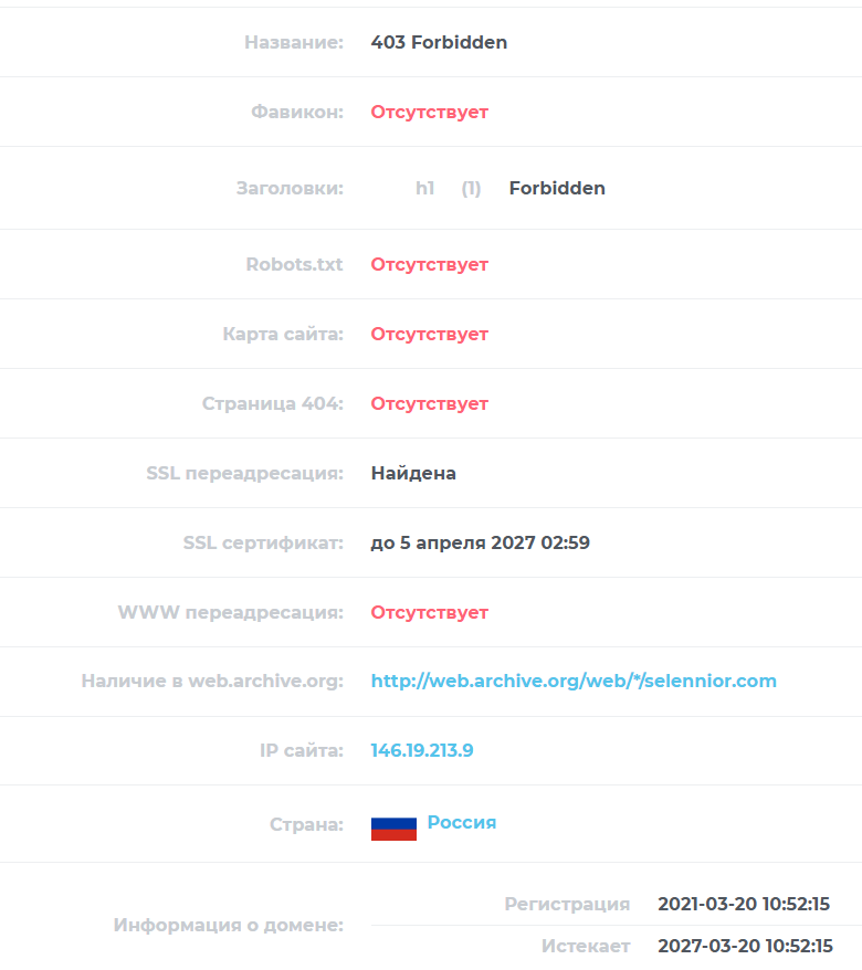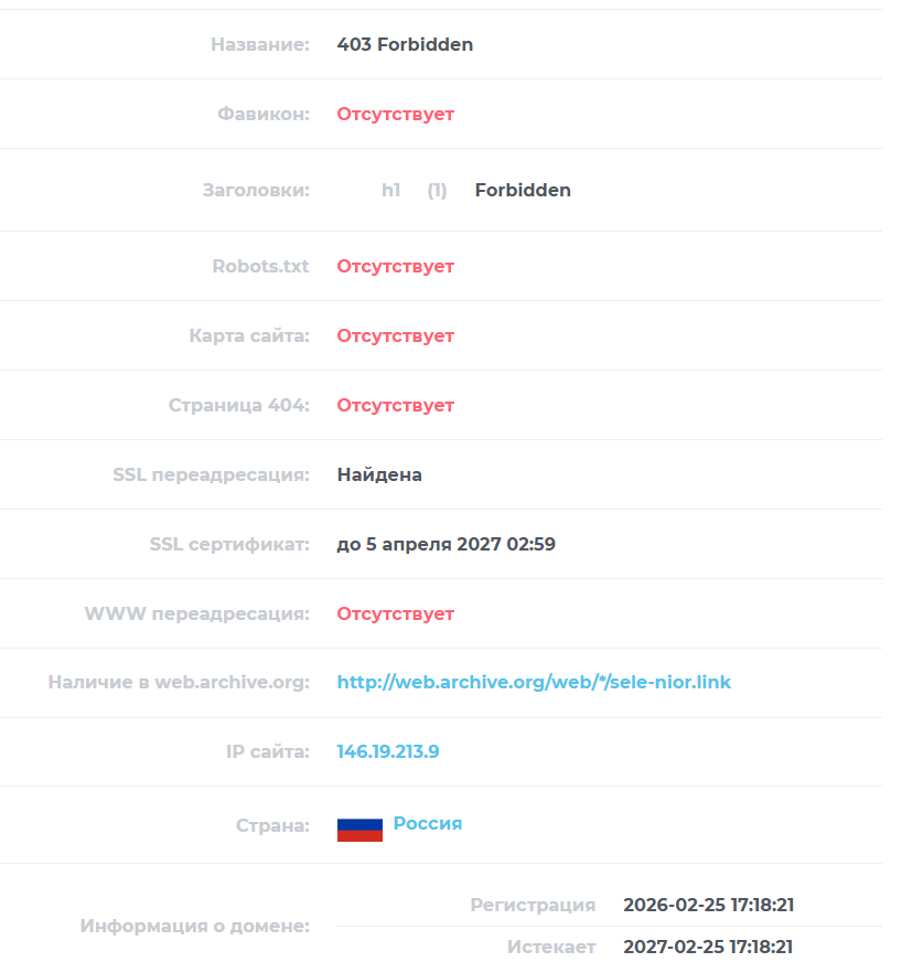 У проекта 2 домена: Sele Nior Link и Selennior com. Годы регистрации – 2026 и 2021 соответственно.