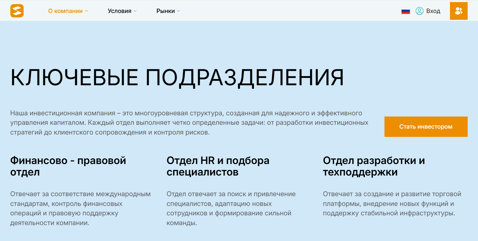 Sele nior – организация, которая предлагает получать прибыль с занятий трейдингом. Она гарантирует положительный результат благодаря обслуживанию со стороны ведущих аналитиков. Но при этом нет рассказа о сотрудниках, фото и профессиональной биографии, только названия и описания подразделений, которые, как кажется, взяты из головы.