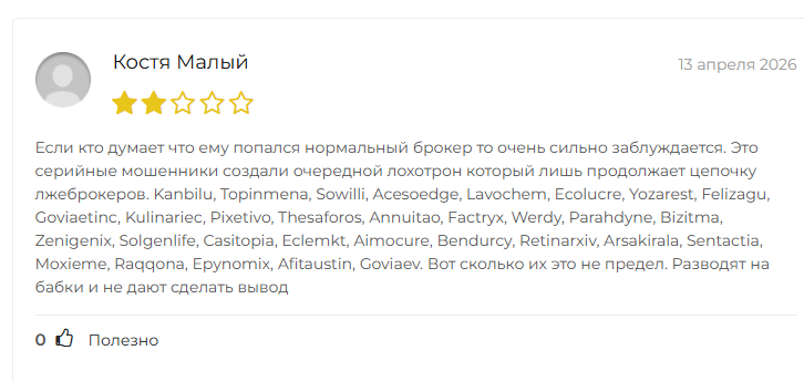 Законом нашей страны работа брокера тоже не регулируется. Похоже, у него в принципе нет регистрации ни в одной стране мира. Финансовые операции он проводит нелегально.