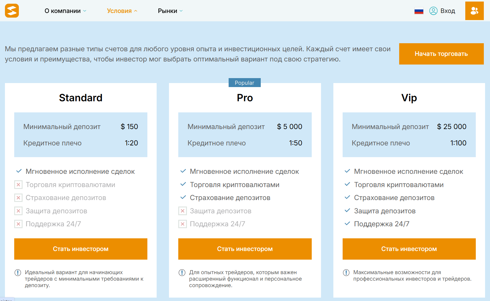 Заявленные депозиты – от 100 до 25 000 долларов. Такой разброс выглядит немного странно, тем более прозрачных условий нет. Подробности о комиссиях и спредах можно узнать только во время торговли на «Селенниор».