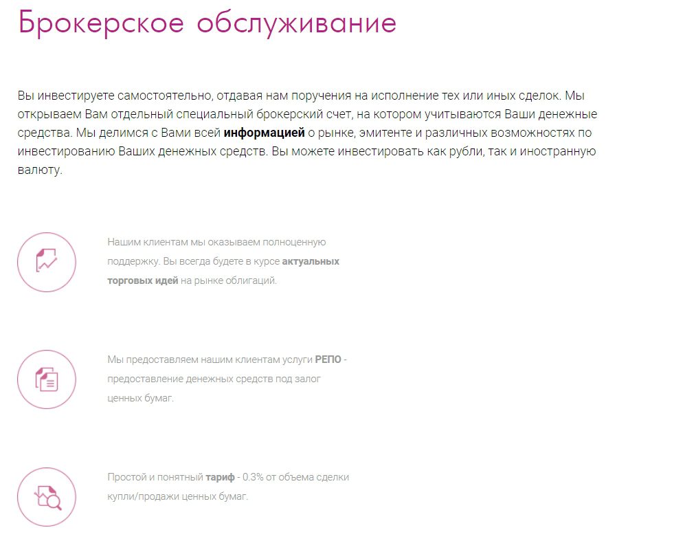 По сути, деятельность брокера основана на посреднических услугах. Он предоставляет доступ к Российской фондовой бирже для торговли ценными бумагами на долговом рынке. Свой выбор создатели платформы мотивируют прогнозируемыми доходами. Пользователям предлагаются инвестиции в облигации, услуги по брокерскому обслуживанию и доверительное управление активами.