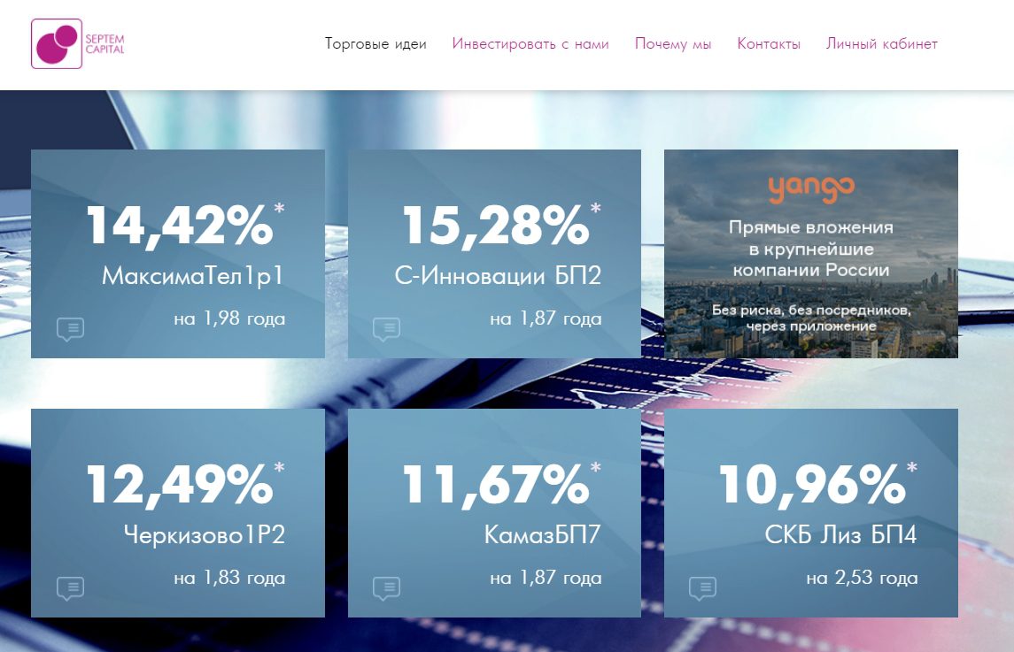 Септем Капитал начал свою работу в 2014 году. Основной специализацией компании являются брокерские услуги на финансовых рынках. Среди инвестиционных направлений стоит выделить криптовалюту, фиаты и облигации. Дополнительно фирма занимается доверительным управлением. Нашими экспертами был проведен доскональный анализ деятельности брокера Septem Capital. О том, насколько безопасно пользоваться услугами конторы, читайте в нашем обзоре.