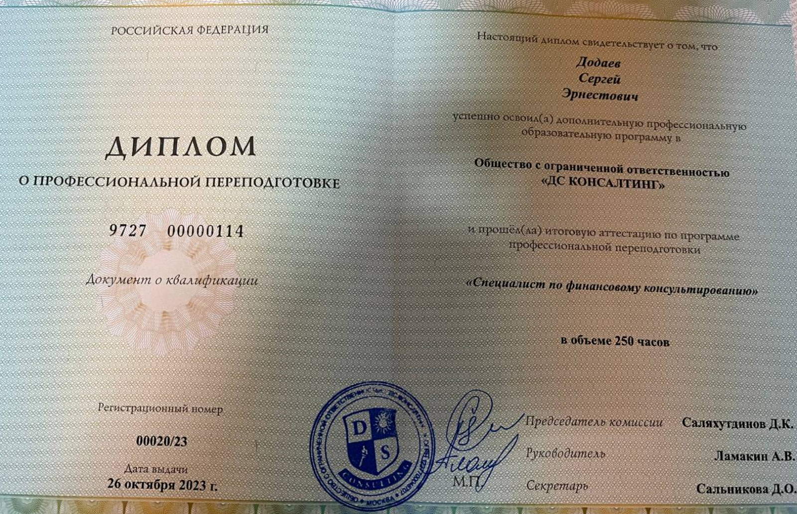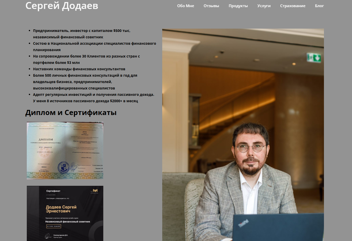 В перечне услуг финансового советника более десятка предложений, это ведение и оптимизация бюджета, подбор инструментов для приумножения капитала, налоговое консультирование и пр. Однако анализ представленных копий документов показывает, что профессию эксперт получил в качестве дополнительного образования в некому неизвестном ООО «ДС Консалтинг», автор проекта «Пассивный доход | Сергей Додаев» также прошел несколько курсов по специальности.