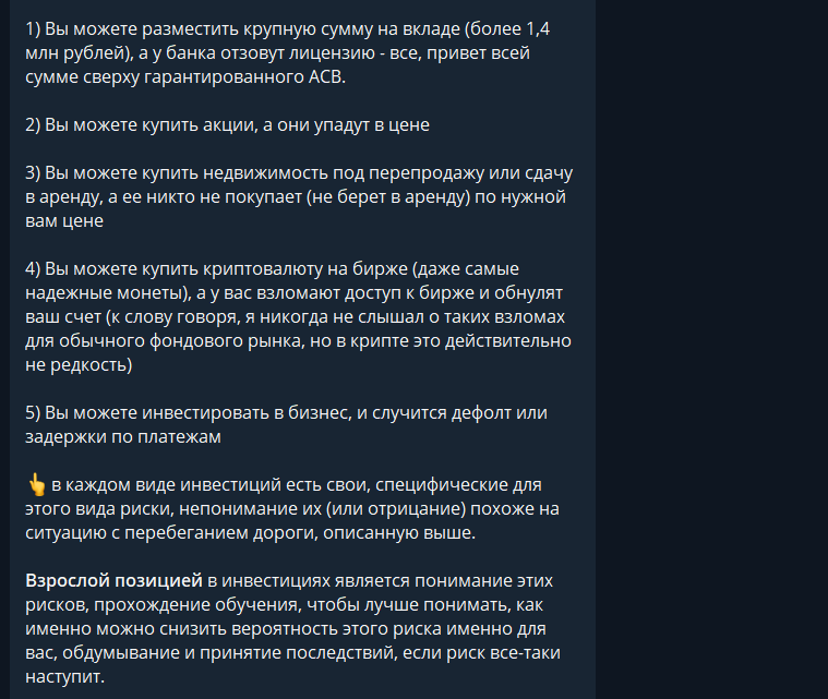 В телеграмм-канале трейдера можно встретить бесплатные разборы позиций на рынках, а также разговорные посты и ответы на вопросы большинства пользователей. Инвестор выкладывает большие публикации, в которых очень подробно проходит по темам заработка.