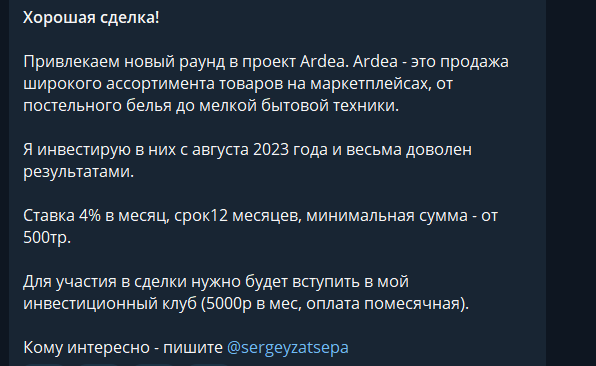 На февраль 2025 года трейдер предлагает одну платную – собственный инвестиционный клуб, в котором клиенты якобы смогут зарабатывать от 4% каждый месяц на своих вкладах. Чтобы совершать сделки с инвестором, необходимо купить хотя бы 1 месяц доступа, стоимость которого около 5 тысяч рублей. Владелец канала «Пассивный Доход», Сергей Зацепа указывает минимальную сумму вложений – 500 тысяч рублей.