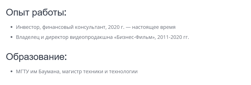 В интернете присутствует информация об инвесторе как о бизнесмене и финансовом консультанте. Информация является официальной, так как располагается на сайте со спикерами России, так что уровень доверия к трейдеру повышается.