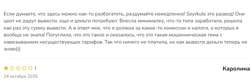 Можно найти разные негативные отзывы о сайте https seyrkule com, где проект обвиняют в разводе и называют фейковой платформой. На самом деле даже минимальные деньги невозможно вывести с сайта, а с трейдеров потребуют доплаты. Заработать не выйдет, поскольку требуется оплата комиссий и налогов, которые никто заранее не оговаривает. Брокера обвиняют в мошенничестве с навязыванием несуществующих тарифов.