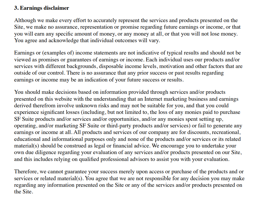На главной странице сайта написано, что с правильным набором инструментов успех неизбежен, но это практически вся информация, которая известна о заработке. Нет никаких данных компании, ресурс постоянно виснет, а во время проверки вообще находился на техническом обслуживании. Внизу главной страницы есть ссылки на документы, в которых много подозрительных моментов, например, связи был указан только email customercare@sfsuite com.