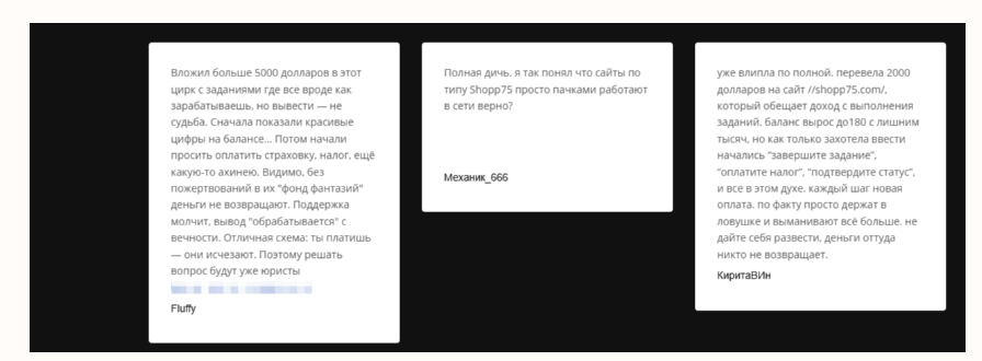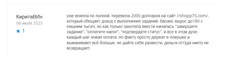 Отзывы о Shopp75 сплошь негативные. Люди пишут, что их обманули и они потеряли деньги. Схема везде одна. Сначала платформа платит небольшие суммы, чтобы вы поверили, что все по-честному. Но потом начинают требовать депозиты для продолжения работы. После перевода денег поддержка пропадает, аккаунт блокируют. Деньги не вернуть. Суммы потерь разные.