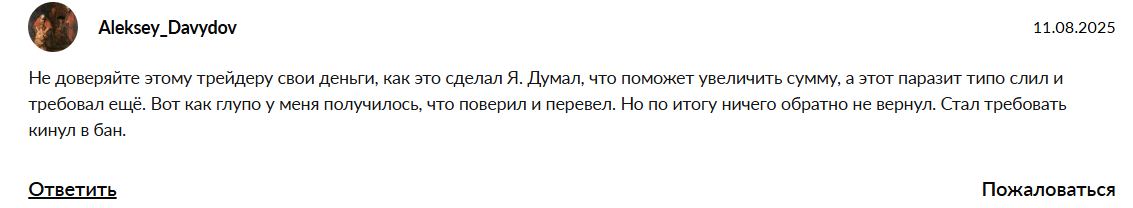- Отрицательные отзывы обвиняют Алекса в сливе средств на сделках и настоящем финансовом разводе, значит, впечатление о репутации трейдера у подписчиков осталось негативное.