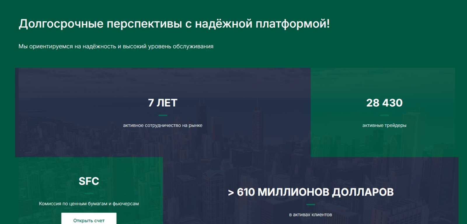 Веб-сайт посредника наделен дизайном в зеленых тонах. Этот цвет вызывает позитивные эмоции и чувство безопасности. Хедер сайта содержит разделы «Условия», «Рынки», «Торговля», «О нас», «Контакты». На брокерском портале нет вкладки «Документы», которая бы ознакомила гостей с регистрацией или лицензией брокера. Организация не предоставляет пользователям данных о юрисдикции, которой регулируется деятельность и обеспечиваются гарантии клиентам.