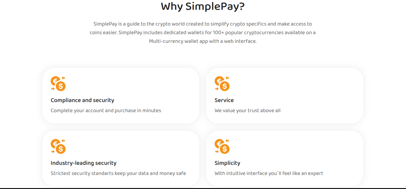 SimplePay — цифровая платформа, которая позволяет пользователям торговать своими активами. В качестве основного финансового инструмента использовать можно только криптовалюты. К тому же, команда биржи прямо об этом говорит и еще отмечает, что инструментарий позволяет использовать цифровые монеты по разным сценариям. Токены можно покупать и продавать в рамках арбитража или же хранить их как на криптокошельках.