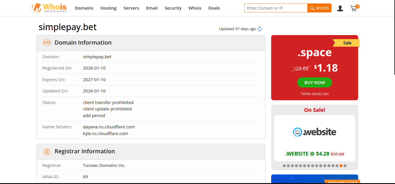 Информации на сайте почти нет, зато есть тонны маркетинга. Нас это не устраивает, поэтому мы решили вопрос по-другому. Через аналитический инструмент WHOIS наша редакция узнала, что запуск биржи был 10.01.2026. При этом у брокера SimplePay был еще другой сайт с доменом «cc», поэтому мы не исключаем, что разработчики просто постарались избежать дальнейших блокировок и создали очередную копию проекта.