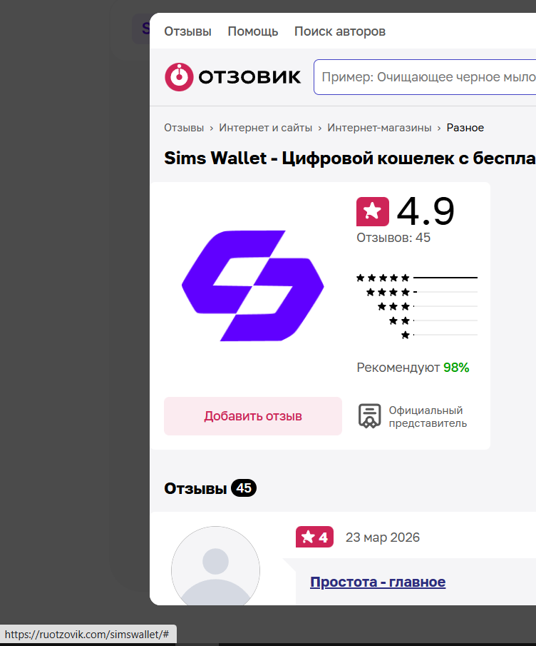 Мы проанализировали сервис и выяснили, что сайт SimsWallet ru появился всего за несколько дней до момента проверки, заявленное юрлицо не имеет отношения к выпуску карт, а в отзывах пользователи жалуются на пропажу денег после пополнения и молчаливую поддержку. По итогу: