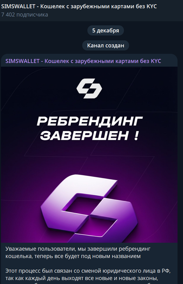 На канале в Telegram «SimsWallet – Кошелек с зарубежными картами без Kyc» 7000 подписчиков, а некоторые посты набрали десятки тысяч просмотров, хотя здесь всего шесть публикаций. Проект запустили 5 декабря 2025 года, а первое сообщение говорит о каком-то ребрендинге из-за смены юридического лица, что вызывает определенные вопросы.