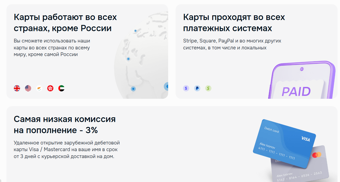 Вносить средства предлагают с помощью СБП, звезд Телеграмм и криптовалютой, после чего можно оплачивать любые зарубежные сервисы.