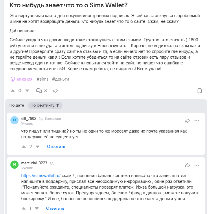 - Пользователи в отзывах о Sims Wallet пишут про скам и сообщают, что после пополнения средства не зачисляются, а поддержка отвечает один раз с обещанием подождать и после этого замолкает, что говорит об отсутствии реальной работы с клиентами.