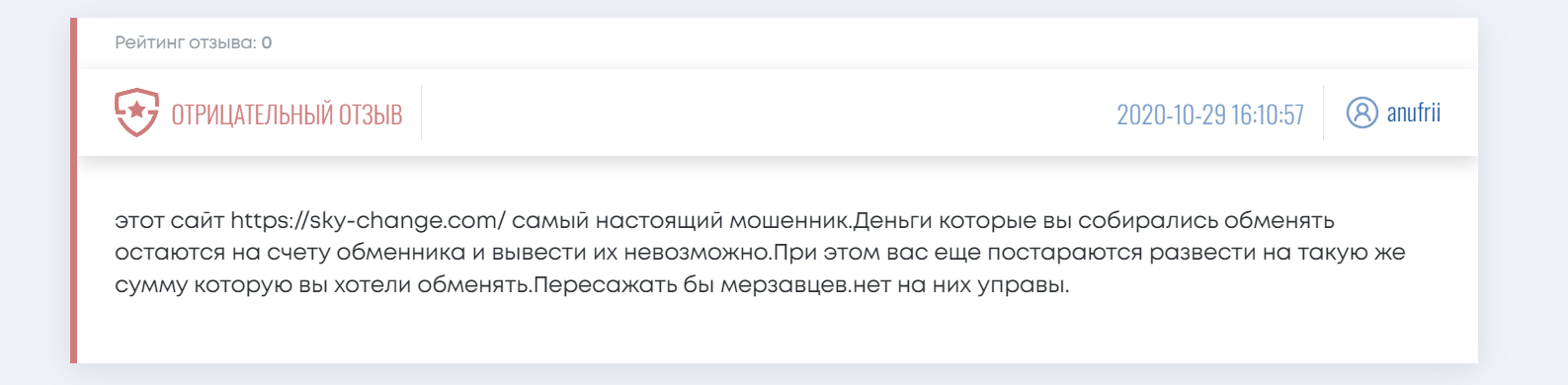 Важно отметить, что в сети нет положительных отзывов о Sky Change. Ни один пользователь не рекомендует использовать этот обменник.