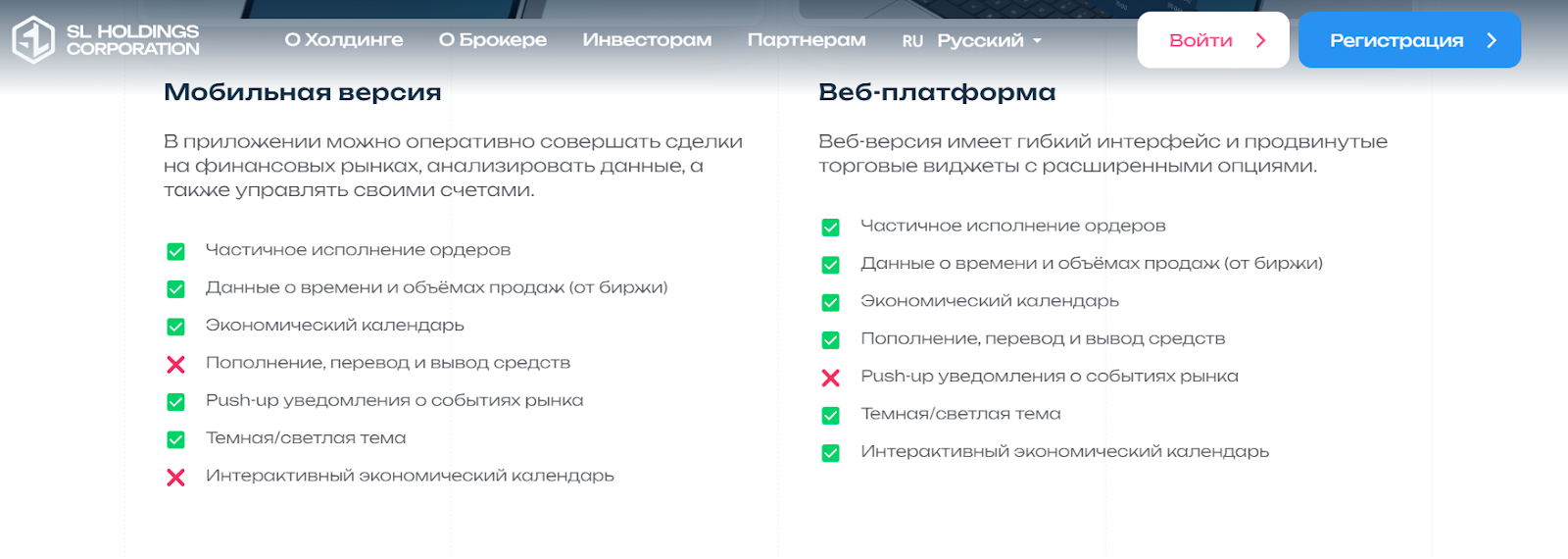 Компания Sl Holding Corporation выступает и в качестве брокера, предоставляя клиентам торговлю Форекс активами, индексами, сырьем и драгоценными металлами, есть акции, доступна фьючерсная торговля. Заявлена торговля криптой. Брокер обязуется предоставить широкий выбор аналитических инструментов, быстрые операции, мобильное приложение и удобный терминал. Мобильное приложение имеет ограничения: нельзя пополнять и выводить средства, нет интерактивного экономического календаря. Зато клиенту доступны push-уведомления. В декстопной версии терминал имеет все возможности кроме уведомлений.