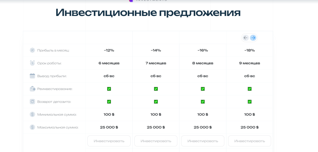 Условия расписаны до годового пакета с доходностью 25%, все суммы инвестиций те же, вывод средств из Sl Holding доступен по выходным. Пользователь вправе реинвестировать капитал, предусмотрен возврат депозита по окончании инвест периода.