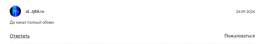 Встречаются краткие, но емкие оценки. Например, анонимный пользователь в сентябре 2024 года коротко написал, что этот канал — обман. Такие оценки звучат эмоционально, но без подробностей. Непонятно, что именно произошло у этого пользователя.