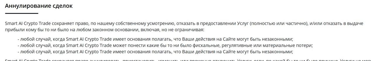 В реестре ЦБ РФ организация Smart AI Crypto Trade не числится. При этом она оказывает услуги российским трейдерам. Но отсутствие правовой защиты от Центробанка России делает сотрудничество с данной площадкой крайне рискованной для россиян. В случае потери депозита вернуть денежные средства будет невозможно.