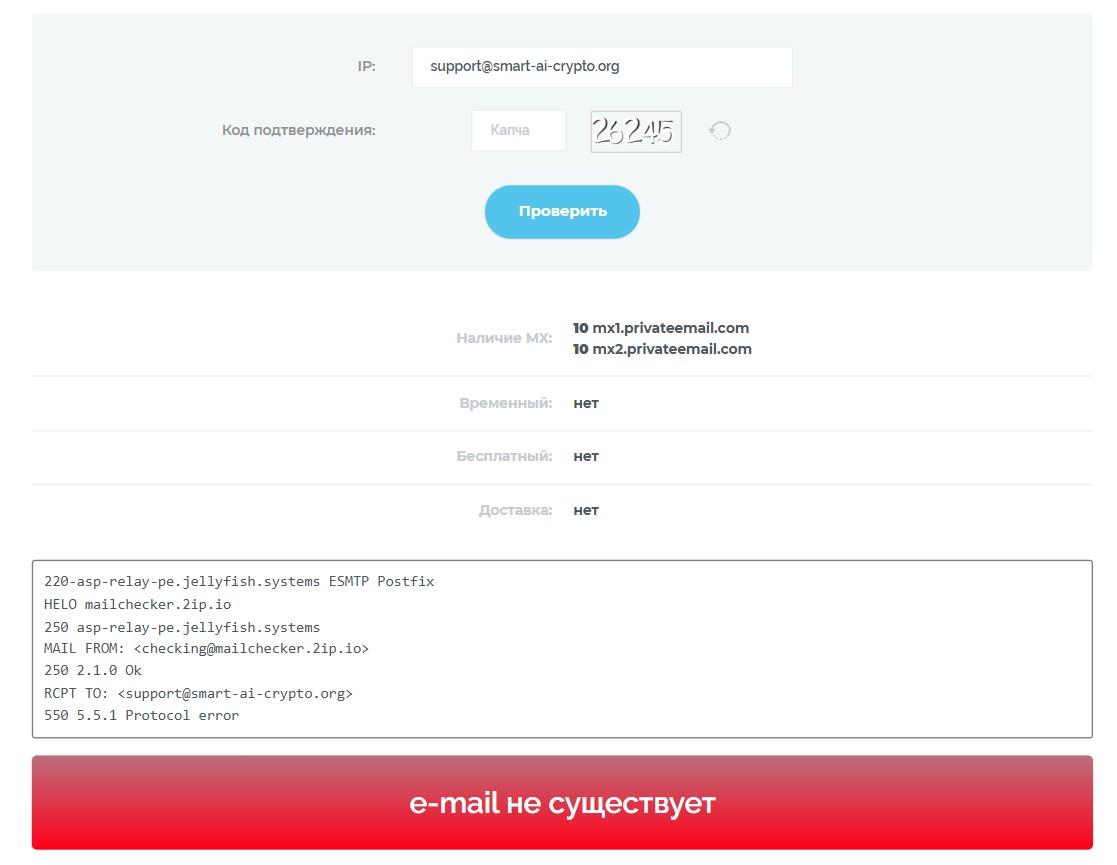 Для связи со службой поддержки компания предоставляет адрес электронной почты – support@smart-ai-crypto org. Мы проверили его через специальный сервис, и оказалось, что этот контакт не существует. Владельцы указали фейковый почтовый ящик. Больше никаких способов для связи брокерская фирма не оставляет, что является тревожным знаком для клиентов.