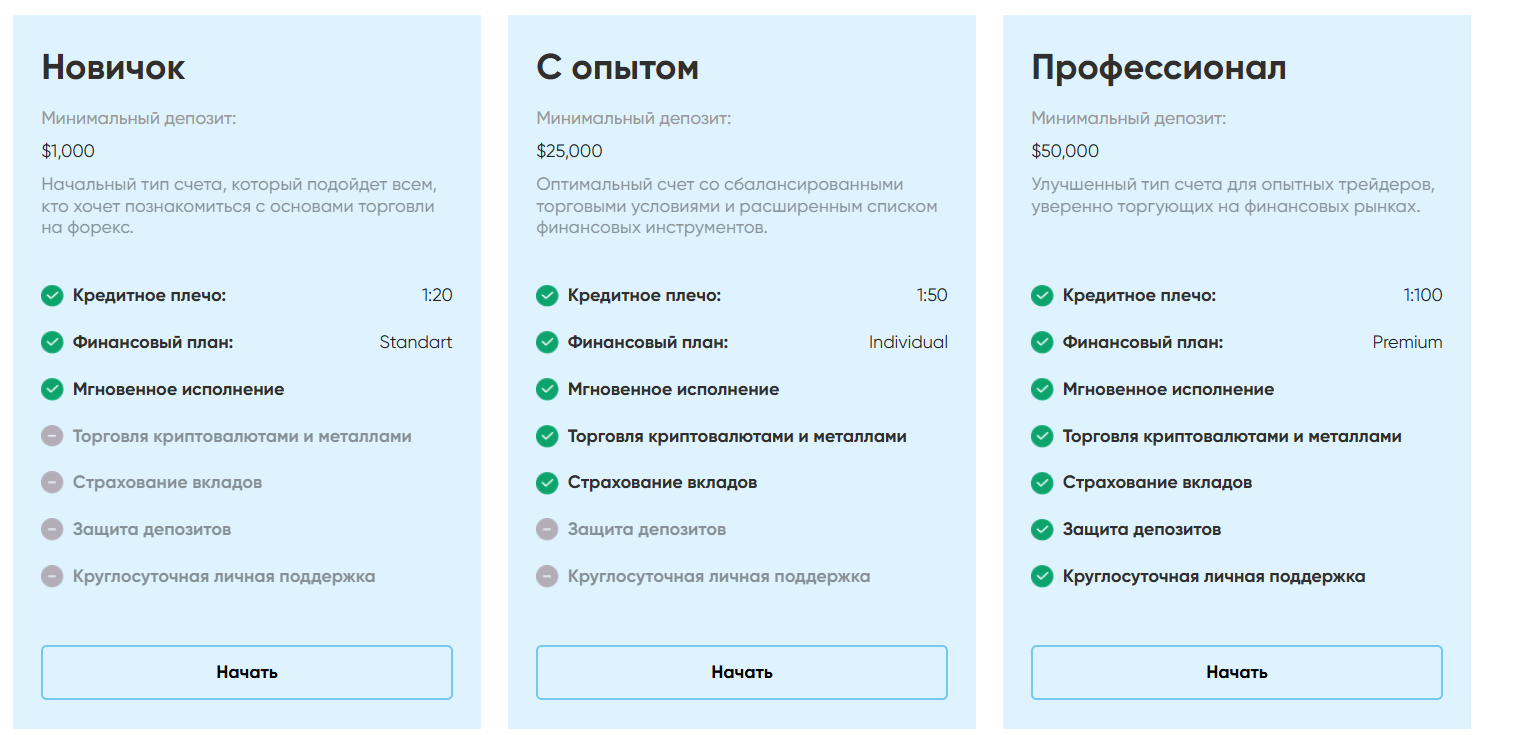 - Новичок — минимальный депозит 1000 долларов, леверидж 1:20, мгновенное исполнение ордеров.