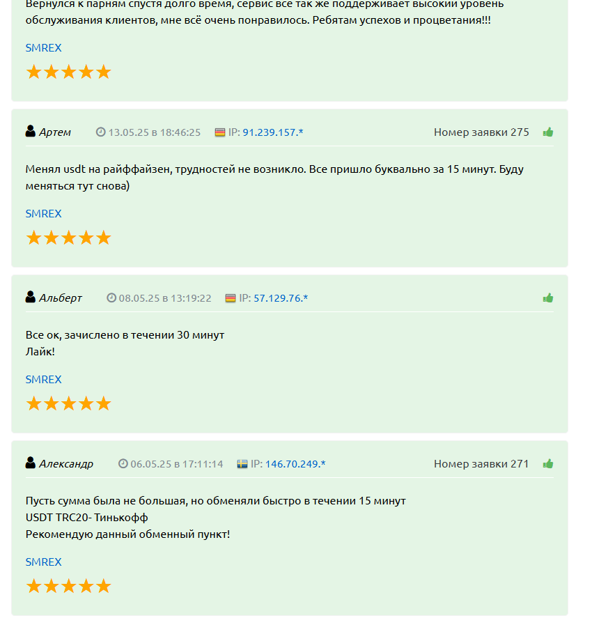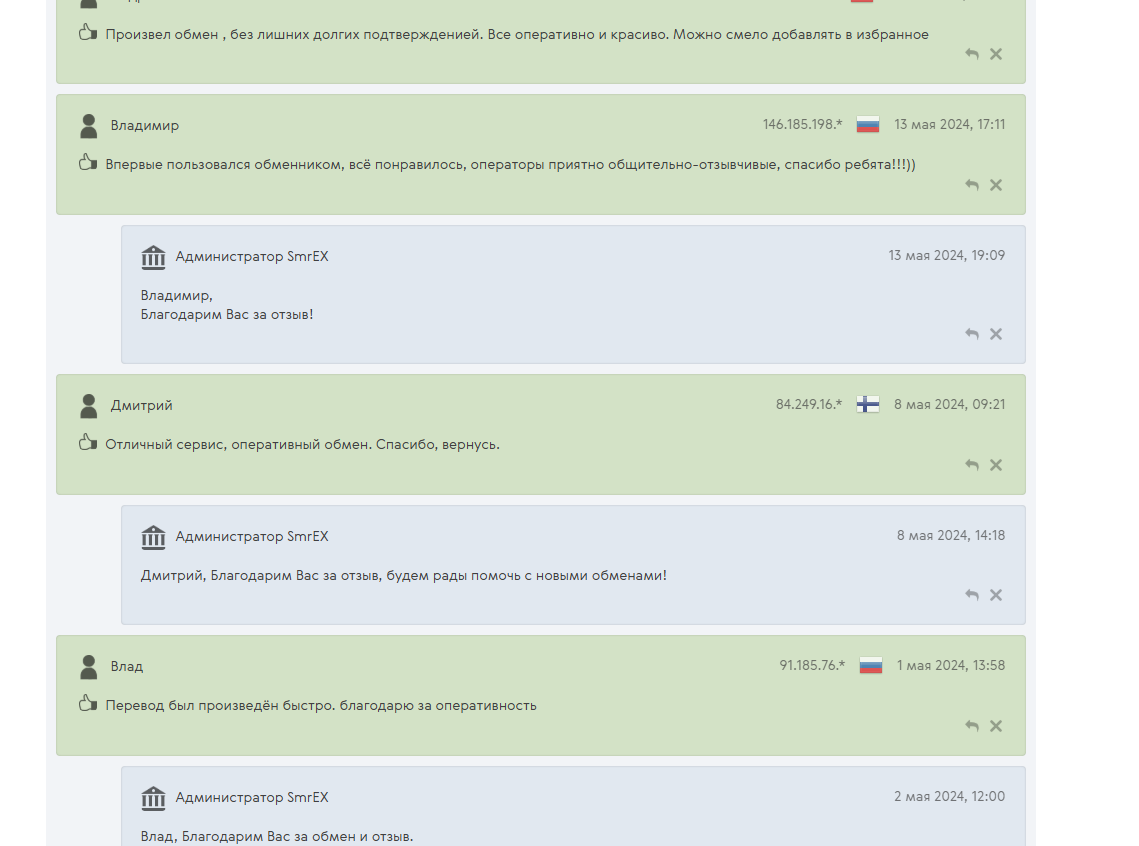 «СмрЕкс» получает в основном положительные отзывы от пользователей – многие клиенты остаются довольны работой обменника. Площадка постоянно развивается и оперативно решает возникающие проблемы, даже в тех случаях, когда пользователи не обращаются напрямую в поддержку, а оставляют комментарии на сторонних ресурсах.