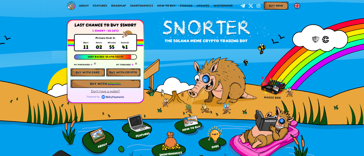 Предпродажа Snorter token (SNORT) уже началась. Концепция слияния рынка мем-коинов и технологий автоматизированной торговли с развитием блокчейна обещает неплохие перспективы. Благодаря поддержке первых спонсоров и сообщества, первые участники могут получить токены до официального листинга по выгодной цене.