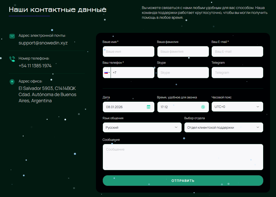 В контактах указан адрес офиса брокера, но на картах он не отображается и, вероятно, не существует в реальной жизни. Поэтому связаться со службой поддержки можно только онлайн, написав на почту support@snowedin xyz или позвонив на горячую линию компании.