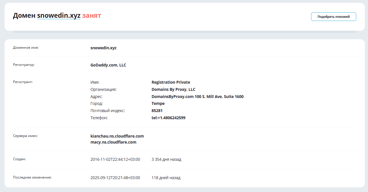 Чтобы проверить биржу SnowEdin xyz, мы решили больше узнать о домене и выяснили, что адрес зарегистрировали в 2016 году. Это могло бы подтверждать работу проекта в течение последних 10 лет, но реальность оказалась обратной.